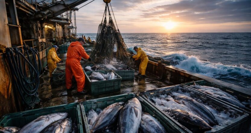 A pesca de atum envolve embarcações de grande porte e expedições prolongadas em mar aberto.